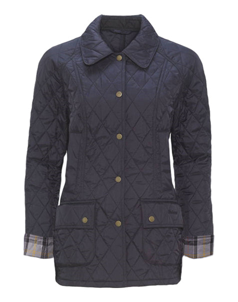 Inspired by the iconic waxed version, the women’s Barbour Summer Beadnell Quilted Jacket is the perfect combination of timeless country looks and practical warmth. This versatile design features a box-quilted matte finish outer, a lightweight wadding for warmth without the bulk, handwarmer pockets and two stud-close lower pockets trimmed with tonal logo embroidery. Simple snap closures fasten through the centre front to a sit-down collar with a throat tab trimmed in Barbour Tartan. A tonal embroidered Barbour logo to the left pocket flap completes the look.