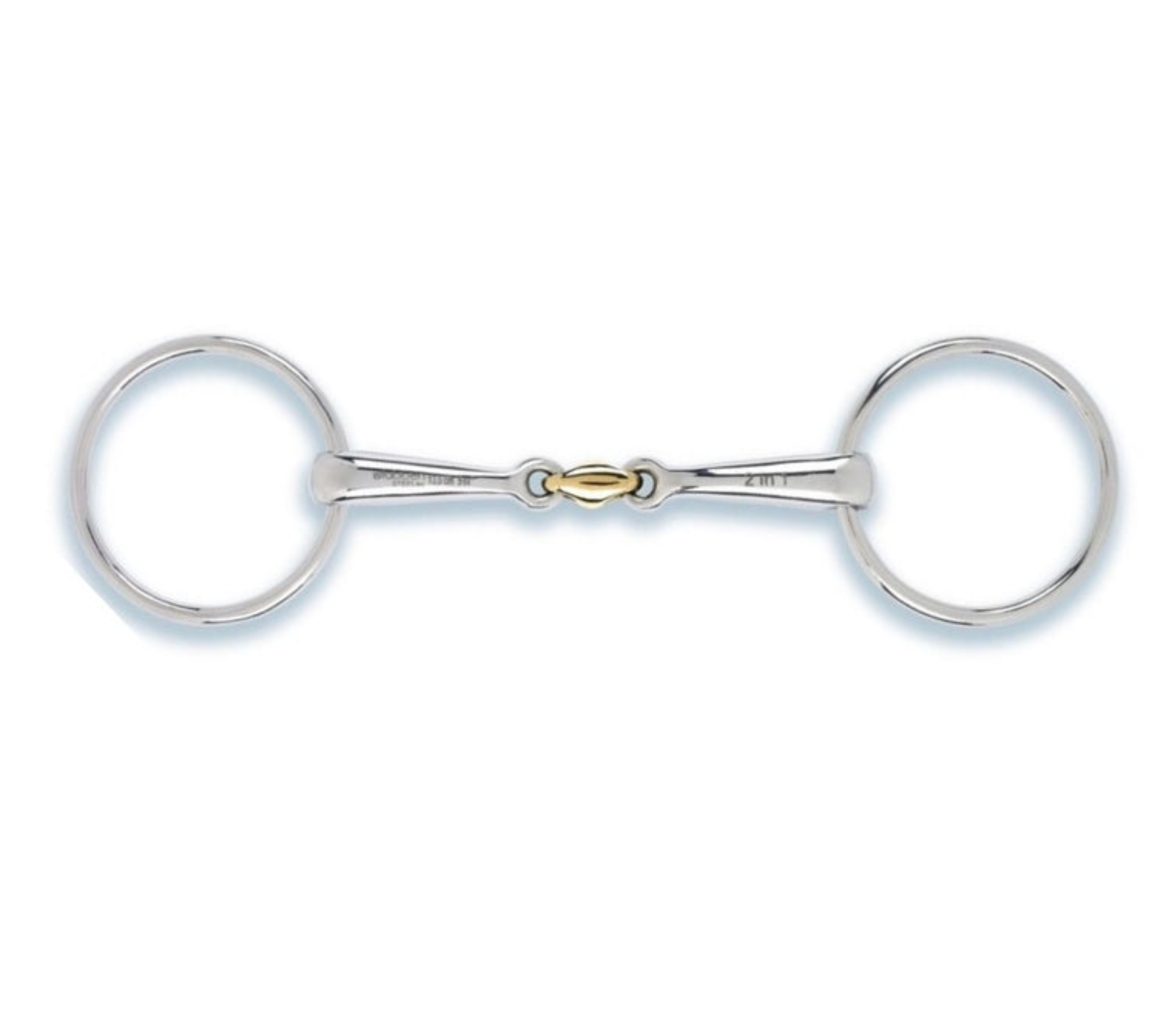 The double-jointed mouthpiece ensures even pressure distribution across the tongue and bars, while the loose rings allow for a neutral position in the horse's mouth.