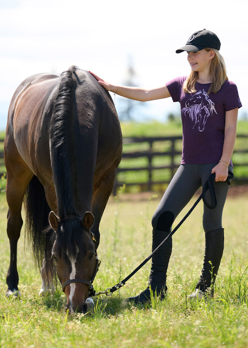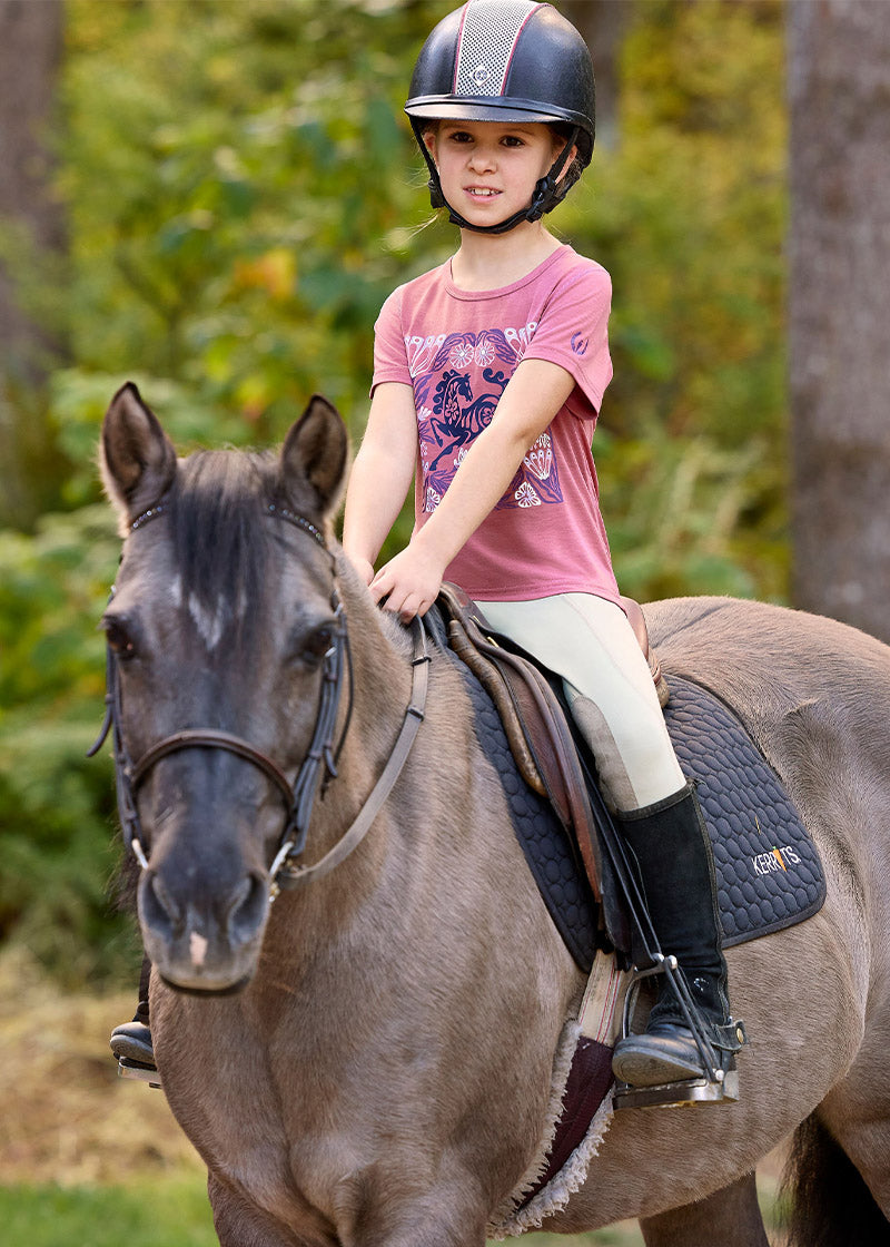 The Kerrits Kids Performance Knee Patch Pocket Riding Tights, ponies worldwide are rejoicing, now their kids can carry treats! With the new addition of two side pockets, it is one more thing kids will love about these ridiculously soft, stretchy tights. In a rainbow of colors that coordinate with their favorite Kerrits tops, these durable tights hold up wash after wash. Adjustable elastic drawstring helps them stretch across seasons.